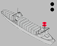 [27b] Drei Rundumlichter (rot – weiß – rot übereinander), wenn Fahrt durchs Wasser gemacht wird auch die üblichen Lichter (Seiten-, Heck- und Topplichter). Am Tag: Ein Ball über einem Rhombus, darunter ein Ball. Diese Signale können etwa gesetzt werden, wenn sich ein großes Schiff in engem Fahrwasser bewegt und es dadurch in seiner Navigationsfähigkeit und seiner Fähigkeit, den Ausweichregeln nachzukommen, beeinträchtigt ist. Andere Schiffe weichen aus. |
