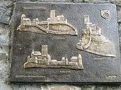 Informationstafeln mit Rekonstruktionsplänen der Löwenburg unterhalb der Burgruine[9][10] | Material: Bronze[9]; Auftraggeber: Staatliches Forstamt Siegburg |