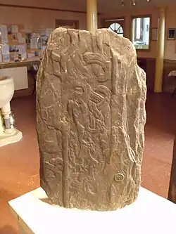 Eine Seite ist mit dem Helden Sigurd und dem Drachen Fafnir verziert. Zuunterst findet sich die Abbildung, wie Sigurd den Drachen mit seinem Schwert tötet. Oben ist Sigurd über dem Feuer dargestellt, in dem das Herz Fafnirs brät, die verbrannten Finger kühlt er im Mund. Einer der Vögel sitzt auf seinem Rücken, während oben sein Hengst Grani, (der Graue) steht.[1] Die andere Seite zeigt eine verstümmelte Figur mit einer Schlange, welche einen späteren Teil der Sage darstellt, als Gunnar, der besessen von dem Schatz war, in die Schlangengrube geworfen wird. Die Szene, in der Sigurd in der Grube mit seinem Schwert in den Drachen sticht, ist am deutlichsten am Kreuz von Jurby und auf Siguard's Cross von Kirk Andreas dargestellt.