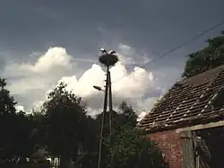 Auf einer kleinen Erhebung in der Mitte des Dorfes entstand 1834 die Kirche, so wie sie in ihren Grundzügen auch heute noch zu finden ist: ein Fachwerkbau mit rechteckigem Grundriss aus Eichenholz. Auf der Westseite ein Turm, dessen Unterbau aus Findlingen besteht und einem hölzernen Oberbau, der nach dem Naugarder Schema gebaut wurde. Umrundet wird die Kirche und die alte Schule von einem Straßenring.[13]