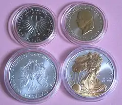 Besonders in Zeiten von Wirtschaftskrisen – wie z. B. ab 2007 – hat sich neben Gold auch das Edelmetall Silber durch seine Kurs- und Wertstabilität als eine der wichtigsten Anlageform in verschiedensten Ausprägungen wie z. B. Silberbarren, Silberschmuck oder Silbermünzen erwiesen.[52] Im Umfeld von Währungskrisen gab es seit der Antike mehrmals in der Geschichte ein Silberverbot (s. Goldverbot).