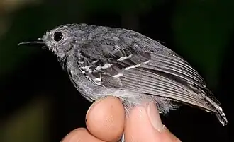 Silber-Ameisenschlüpfer (Myrmotherula longipennis) in der Hand | ||||||||||||