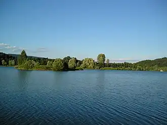 Im südwestlichen Teil des Sees befindet sich eine mit Gras, Schilf und Bäumen bewachsene Insel. Der See besitzt weder Zu- noch Abflüsse.