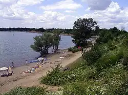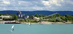 Am See wird bis heute Kies gefördert. Der Name des Sees stammt von der gleichnamigen Firma, die hier eine Saugbaggeranlage installiert hat, um Kies aus einer Tiefe von 60 Metern zu gewinnen. Heute wird das Kieswerk von Heidelberg Materials betrieben. Die jährliche Fördermenge beträgt etwa 260.000 Kubikmeter.[14] Aufgrund des tief liegenden Wasserspiegels ragen hinter dem kleinen Strand hohe Böschungen empor.