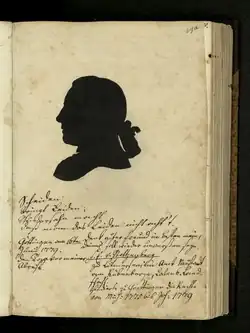 1778–1779 | Skara Stifts- och Landsbibliotek[18] | Stammbuch mit Einträgern aus der Hannöverschen, Kurländischen und anderen Landsmannschaften sowie Mitgliedern des Studentenordens ZN. Silhouette Nr. 98 in der Silhouetten-Sammlung Schubert. | ![]() |