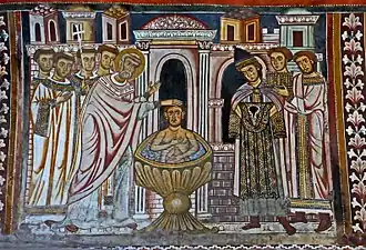 An den Wänden des Silvester-Oratoriums im ersten Vorhof der römischen Basilika Santi Quattro Coronati entstanden um 1246 Fresken byzantinischer Meister,[11] unter denen vor allem die Szenen der Silvester-Legende religionshistorisch und zeitgeschichtlich bedeutsam sind. In acht Bildern wird dargestellt, wie der vom Aussatz befallene Kaiser Konstantin nach Silvester I. habe rufen lassen, nachdem ihn im Traum die Heiligen Petrus und Paulus dazu aufgefordert hätten. Silvester habe ihn durch ein wundersames Bad (Taufe) geheilt und habe dafür zum Dank die Stadt Rom als Geschenk erhalten.[12]