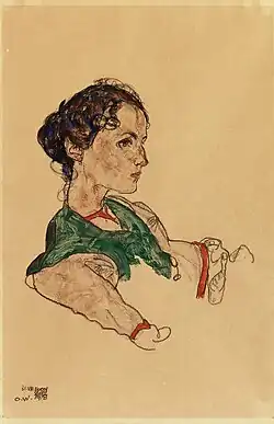 - Sitzendes Mädchen, 1926, Farbkreide und Kohle auf Papier, Lentos Kunstmuseum Linz