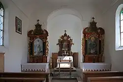 Der Hochaltar hat zwei weinlaubverzierte Säulen und stammt aus dem Jahr 1662. Das Altarbild stellt Mariä Heimsuchung dar. Es wurde von Martha Strele gemalt. Der linke Seitenaltar ist ein barocker Altaraufbau mit zwei gedrehten Säulen. Das Altarbild zeigt den heiligen Bartholomäus und wurde von Alfons Luger gemalt. Der rechte Seitenaltar ist der gleiche Aufbau wie der linke Altar, nur das Altarbild stellt den heiligen Laurentius dar. Das Bild malte Franz Lins.