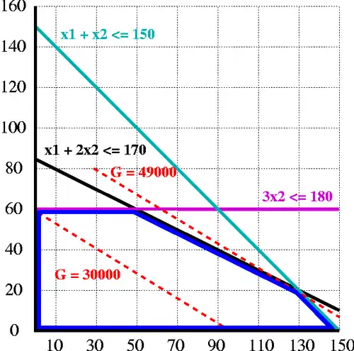 Eine Firma stellt zwei verschiedene Produkte her. Es stehen drei Maschinen A, B, C zur Verfügung. Maschine A hat eine maximale monatliche Laufzeit (Kapazität) von 170 Stunden, Maschine B von 150 Stunden und Maschine C von 180 Stunden. Eine Mengeneinheit (ME) von Produkt 1 liefert einen Deckungsbeitrag von 300 Euro, eine ME von Produkt 2 dagegen 500 Euro. Fertigt man 1 ME von Produkt 1, benötigt man dafür 1 Stunde die Maschine A und zusätzlich 1 Stunde die Maschine B. 1 ME von Produkt 2 belegt sowohl 2 Stunden Maschine A, als auch 1 Stunde Maschine B und 3 Stunden Maschine C.