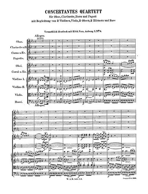 - ↑ Sinfonia concertante in E-flat major for Oboe, Clarinet, Horn, Bassoon and Orchestra, K. Anh. 9 / Anh. C 14.01 (spurious or doubtful). In: MusicBrainz