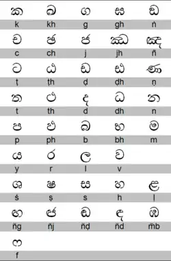 Die singhalesische Schrift besitzt 40 Konsonanten, von denen 13 nur im gemischten Alphabet vorkommen. Die Transliteration wird in dieser Tabelle ohne den inhärenten Vokal a dargestellt, der normalerweise immer vorhanden ist, wenn der Konsonant kein Vokalzeichen oder Virama besitzt.