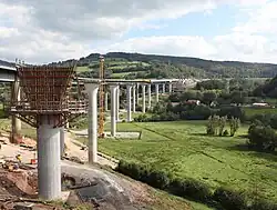Die Widerlager und Pfeiler waren flach gegründet. Die Fundamente der 45 m hohen Talpfeiler waren bei einer Grundrissfläche von 9,3 m × 8,1 m im Regelfall 2,5 m dick. Der Unterbau bestand unter anderem aus sieben Pfeilerpaaren mit begehbaren Kreishohlquerschnitten aus Stahlbeton. Der Pfeilerdurchmesser betrug 4,2 m, die Wandstärke 35 cm. Die Pfeilerpaare waren nicht durch Kopfriegel miteinander verbunden.