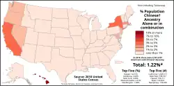 Sinoamerikaner sind Einwohner der Vereinigten Staaten, die entweder in China geboren wurden oder (zumeist han-)chinesische Vorfahren haben (s. a. Auslandschinesen). Im Jahr 2000 gab es etwa 2,3 Millionen Sinoamerikaner, was etwa 22,4 Prozent aller asiatischen US-Amerikaner entsprach.[1][2] Beim Zensus 2010 war die Anzahl auf 3,8 Millionen gestiegen.[3] Im Jahr 2016 wurde eine Chinesische Bevölkerung von 4,9 Millionen gezählt, was ca. 1,5 % der US-amerikanischen Gesamtbevölkerung entspricht.[4]