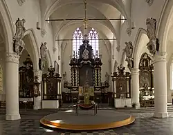 Der außergewöhnlich breit erscheinende Innenraum ist im barocken Stil des 17. Jahrhunderts eingerichtet. Über den Fußboden verteilt befinden sich ungefähr 90 Grabsteine von Priestern oder Beginen. Sehenswert ist das Gemälde „Christus am Kreuz“ von Pieter Jozef Verhaghen, welches sich im Chorraum befindet, sowie „Die heilige Familie“ von Jan Cossiers im rechten Seitenschiff.