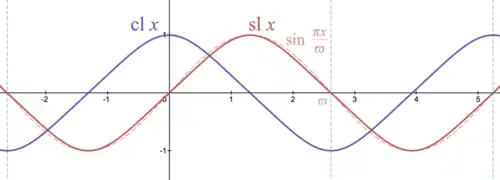 {\displaystyle {\begin{aligned}\operatorname {sl} (z+2\varpi )=\operatorname {sl} (z),\qquad &\operatorname {sl} (z+2\mathrm {i} \varpi )=\operatorname {sl} (z),\\\operatorname {cl} (z+2\varpi )=\operatorname {cl} (z),\qquad &\operatorname {cl} (z+2\mathrm {i} \varpi )=\operatorname {cl} (z),\end{aligned}}}