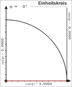 Die Entstehung der Sinus- und Kosinusfunktion aus der Drehbewegung eines Winkelschenkels beginnend bei der -Achse veranschaulicht folgende Animation. Der Winkel wird im Bogenmaß gemessen. Ein Winkel von entspricht einem Bogenmaß von .