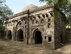 - Deutlich besser erhalten bzw. restauriert ist die aus exakt behauenen, aber farb- und nahezu ornamentlosen Steinen unterschiedlichen Formats erbaute Muhammad-Wali-Moschee. Die dreiportalige Fassade zeigt einen Mittelrisalit und zahlreiche kleine Wandnischen mit abgeschrägten Platten mit vegetabilischen Reliefs; sie sind von Spitz- und Kielbögen überhöht. Darüber befindet sich 18 Konsolen, über deren Zweck Unklarheit besteht. Ein Zinnenfries bildet den oberen Abschluss der Fassade. Die mittlere Kuppel wird von sich kreuzenden Rippen unterfangen und ruht auf einem Blendnischen-Oktogon mit Muqarnas-ähnlichen Pendentifs.