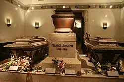 Ihrem Wunsch, „am Meer, am liebsten in Korfu“ ihre letzte Ruhestätte zu finden, wurde nicht entsprochen. Als der Leichnam in einem eisgefüllten Sarg in ihrem Salonwagen nach Wien überführt wurde, waren alle Beamten des Kaiserreichs entlang der Strecke verpflichtet, der Toten im Zug die Reverenz zu erweisen.[29] Am 17. September 1898 fand die Beisetzung in der Wiener Kapuzinergruft statt. Elisabeths einbalsamierter Leichnam ruht vollständig in der Kapuzinergruft. Dies ist eine Ausnahme, denn bei den meisten Habsburger Herrschern wurde der Leichnam zerteilt: Deren Körper wurden in der Kapuzinergruft bestattet, ihre Herzen in der Augustinerkirche und ihre Eingeweide im Stephansdom.[24] (Siehe dazu auch den Artikel: Getrennte Bestattung.) Elisabeths Sarkophag steht heute neben denen von Franz Joseph I. und Kronprinz Rudolf.