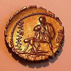 Im Jahr 71 v. Chr. ließ ein Enkel des Konsuls Manius Aquilius als einer der Münzmeister des Jahres einen Denar prägen, der an die Niederschlagung des Zweiten Sklavenaufstands erinnert. Auf der Rückseite der Münze hilft ein Legionär der personifizierten Sizilia auf. Der Abschnitt der Münze zeigt die Aufschrift SICIL für Sizilien. Im Jahr 71 v. Chr. wurde der Dritte Sklavenkrieg von einem Konsul aus einer anderen Familie beendet. Es liegt deshalb nahe, dass die Prägung in einer durch starke Konkurrenz der senatorischen Familien gekennzeichneten Zeit auch an den 30 Jahre früheren Erfolg aus der Familie des Münzmeisters erinnern soll.