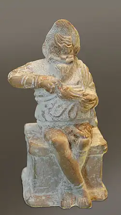 Weiter vertraten Sklaven den Meister bei Bedarf in seinem Beruf und begleiteten ihn zu Arbeitseinsätzen und auf Reisen. Im Krieg begleiteten sie die Soldaten als persönliche Bedienstete; teils wird auch die Auffassung vertreten, dass sie eine noch deutlich wichtigere militärische Rolle spielten.[40] Sklavinnen erledigten Hausarbeiten, namentlich das Backen und Weben. Nur die ärmsten Bürger besaßen nicht mindestens einen Dienstboten.[41]