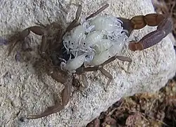 Nach einigen (bis zu zwölf) Monaten gebiert das Weibchen lebende Junge (Viviparie), die Eier werden also bereits im Uterus „ausgebrütet“. Die Anzahl der jungen Skorpione kann artspezifisch zwischen 2 und über 100 betragen. Die Jungskorpione sind bei der Geburt weiß, und jedes ist einzeln von einer Embryohaut, dem Chorion, umschlossen. Nachdem sich die Jungskorpione aus dieser befreit haben, steigen sie auf den Rücken der Mutter, die sie bis zur ersten Häutung herumträgt. Die erste Häutung erfolgt je nach Art und äußeren Bedingungen nach 1 bis 51 Tagen. In dieser Zeit sind die Weibchen besonders aggressiv. Die Ernährung der Jungskorpione erfolgt in dieser Zeit durch körpereigene Reserven, Flüssigkeit bekommen sie durch die Rückenhaut der Mutter.[9]