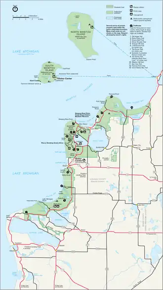 - National Park Service: Sleeping Bear Dunes National Lakeshore (offizielle Seite; englisch)