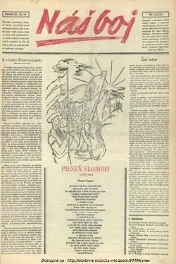 Die Halbmonatszeitschrift „Náš boj“ erschien erstmals am 1. September 1942 mit einer Auflage von 4000 Exemplaren und hatte sich ganz der Ideologie des „Neuen Europa“ verschrieben. Nageler, dem die religiösen Bindungen in der Slowakei ein Dorn im Auge waren, sah in dem Blatt auch das geeignete Instrument, um „panslawistische, liberalistische und klerikale Vorstellungen“ zu bekämpfen und „über eine bloß staatspolitische Verbindung des slowakischen mit dem deutschen Schicksal eine tiefere, haltbare Verbindung“ herzustellen.[79] Auch die Unterstützung des „Náš boj“-Kreises sank von 3500 Sympathisanten im Jahr 1942 auf nur noch etwa 150 Männer im Herbst 1943, diese umfassten jedoch die Elite der slowakischen nationalsozialistischen Extremisten. Der Kreis umfasste mehrere Lehrer der Universität Bratislava, Schriftsteller, Journalisten, Mediziner, Richter, hochrangige Offiziere der Hlinka-Garde und andere. Dennoch blieb der Einfluss von „Náš boj“ auf das öffentliche Leben vergleichsweise unbedeutend. Erst nach dem Ausbruch des Slowakischen Nationalaufstands wurden Otomar Kubala im Herbst 1944 die Hlinka-Garde und die slowakische politische Polizei ÚŠB unterstellt. Daraufhin assistierte die Hlinka-Garde den deutschen Besatzungstruppen bei einer Reihe von Gräueltaten, vor allem bei der Verfolgung der jüdischen Bevölkerung.[80]