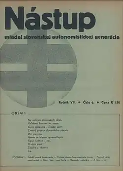 Die von den Schülern Vojtech Tukas 1932 gegründete rechtsradikale Zeitschrift Nástup repräsentierte die radikalste Variante des slowakischen Nationalismus. Zudem bestand eine personelle Kontinuität zwischen der offiziell aufgelösten Organisation Rodobrana, der Studentenbewegung um Nástup und der 1938 gegründeten Hlinka-Garde. Hinter Nástup standen die Brüder Ján und Ferdinand Ďurčanský, außerdem gehörten zur Redaktion bzw. den Autoren neben anderen auch Karol Murgaš, Karol Sidor und Alexander Mach. Die Beiträger des Nástup – junge katholische Studenten – sprachen sich für bessere Beziehungen mit den rechten diktatorischen Regimen in Mitteleuropa aus und äußerten sich regelmäßig aggressiv antitschechisch, antiungarisch und antisemitisch.[16]