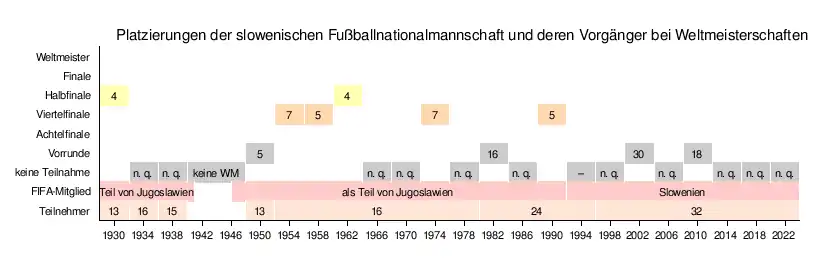 Slowenien war Teil von Jugoslawien. Jugoslawien meldete sich zu allen Weltmeisterschaften an und konnte sich für acht der 14 WM-Endrundenturniere qualifizieren. Slowenische Spieler kamen aber nur 1974 und 1990 zum Einsatz.