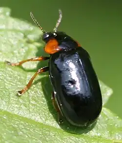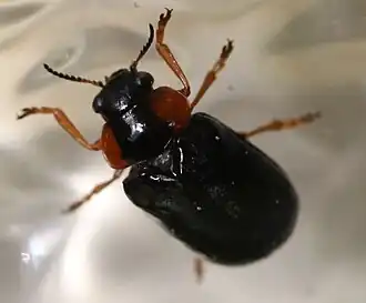 Der Käfer hat eine Körperlänge von 4,5–6 mm.[2][3] Die Käfer besitzen eine schwarze Grundfarbe mit bläulichem Schimmer. Der Halsschild ist kaum punktiert.[2] Er besitzt breite rotgelbe Seitenränder. Die Flügeldecken sind fein und flach punktiert.[2] Die Beine sind gelb gefärbt. Die Fühler sind an der Basis gelb und werden zu den Spitzen hin dunkel.
