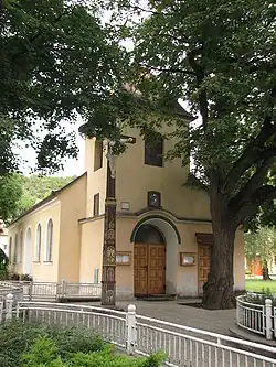 - farbig verziertes Kreuz aus dem 19. Jahrhundert, vor der Kapelle
