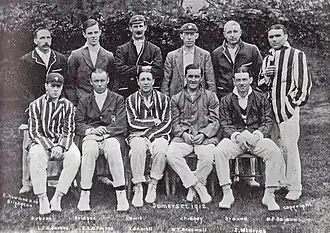 Spiele von Mannschaften die unter dem Namen Somerset firmierten sind bis ins Jahr 1845 dokumentiert.[1] Gegründet wurde der County Cricket Club im August 1875. Eine Mannschaft mit dem Namen Gentlemen of Somerset, die seit 1860 Spiele austrug,[2] führte ein Zweitages-Spiel gegen die Gentleman of Devon in Sidmouth durch. Dieses konnte mit acht Wickets gewonnen werden.[3] und so entschloss man sich nach dem Spiel einen County Club zu gründen.[4] Ursprünglich plante man sich kein festes Heimatstadion zu suchen, sondern seine Heimspiele über verschiedene Spielflächen im County auszutragen. Dies änderte sich erst 1881, als der Taunton Athletic Club nahe dem Fluss Tone ein Spielfeld errichtete. Dieses wurde seit 1882 für Spiele verwendet. Ursprünglich hatte Somerset keinen First-Class-Status, doch nachdem die Mannschaft 1890 die 'Second-Class-Championship' gewonnen hatte, erfolgte der Aufstieg zur Saison 1891.[4] In ihrer zweiten Saison 1892 erreichten sie einen dritten Platz, jedoch befanden sie sich bis zum Ersten Weltkrieg zumeist in der unteren Tabellenhälfte. Vier Mal (1908, 1910, 1911 und 1913) endete die Saison sogar am Tabellenende. Spieler wie die Nationalspieler Lionel Palairet, Sammy Woods und Jack White waren vor dem Ersten Weltkrieg wichtige Stützen der Mannschaft.[4]