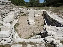Das Heiligtum Nr. 1 hat einen apsidenförmigen Grundriss mit leicht nach innen gewölbter Fassade. Die Außenmaße sind 7,80 Meter (von der Apsis zur Fassade) und 8,80 Meter (Breite der Fassade). Die doppelten Wände haben eine durchschnittliche Dicke von 1,20 Meter. Die Fläche des Innenraums beträgt 30,66 m². Der einzige Zugang befindet sich in der Mitte der Fassade. Im Innern des Gebäudes ist die Basis einer zentralen Säule erhalten. Etwa 0,40 Meter breite Bänke laufen an der Innenwand der Fassade und dem angrenzenden Teil der Seitenwände entlang. Es wurden zwei Strukturen aus gebrannten Tonplatten begrenzt durch halbkreisförmig gelegte Steine gefunden. Aschefunde belegen, dass es sich um Feuerstätten handelt.[1]