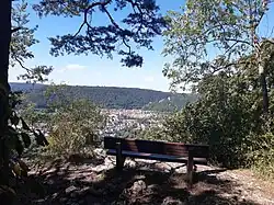 - Der Aussichtsfels mit Sitzbank, Blick über das Blautal, den Rucken und die Kernstadt von Blaubeuren.