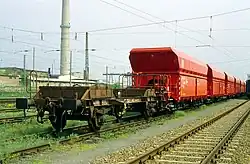 DR-Kuppelwagen nach Umbau auf Intermat-Kuppelkopf mit Schraubenkupplung in der SA-3-Aufnahme bei einer Erzwagenüberführung