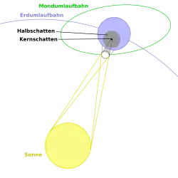 Sonne und Mond erscheinen einem Beobachter auf der Erde mit ungefähr dem gleichen scheinbaren Durchmesser von etwa 0,5°. Bei bestimmten Konstellationen kreuzt der Mond den Weg der Sonnenstrahlen und kann die Sonnenscheibe vorübergehend vollständig abdecken. Die bei solch einer totalen Sonnenfinsternis auf die Erde fallende Spur des Kernschattens des Mondes ist höchstens einige hundert Kilometer breit. Hingegen misst der Halbschatten des Mondes – wegen der flächigen Lichtquelle Sonne ein Übergangsschatten mit fließendem Helligkeitsübergang – mehrere tausend Kilometer, so dass daneben von mehr als einem Viertel der Erdoberfläche aus eine partielle Verfinsterung der Sonne zu beobachten ist.