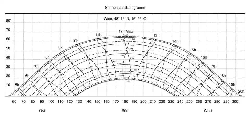 - ↑ Beispiel auch in: G.Waller: Sonnenstandsdiagramm und Strahlungsbilanzen, Seite 8: Sonnenstandsdiagramm für Kiel ( vom 28. Februar 2013 im Internet Archive) (PDF 337 kB)