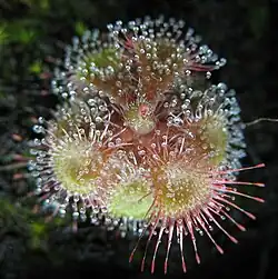 - Queenslanddrosera: Eine kleine Gruppe dreier eng verwandter Arten (Drosera schizandra, Drosera prolifera und Drosera adelae), die bei extrem hoher Luftfeuchtigkeit und geringer Lichtintensität in tropischen Regenwäldern im Norden des australischen Bundesstaates Queensland gedeihen und dort endemisch sind. Sie bevorzugen allerdings unterschiedliche Mikrohabitate und kommen nie gemeinsam vor.[4]