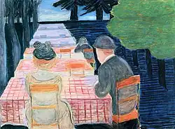 Das Gemälde zeigt Werefkins formale und ikonologische Verwandtschaft mit Edvard Munch. Zweifelsfrei diente ihr sein „Selbstbildnis mit Weinflasche“ von 1906 als Anregung. Jedoch setzte sie das Munch’sche Gemälde nach persönlichem Empfinden und Erleben um, analog einer Erklärung Munchs: „Ich male nicht, was ich sehe, sondern was ich sah“[3], die weitgehend den programmatischen Forderungen Gauguins und seiner Schüler von Pont-Aven entspricht. Aufschlussreich sind die Vertauschungen und Veränderungen, die sie in ihrem Bild gegenüber der Vorlage vornahm. Sie verlegte die Begebenheit z. B. von dem Innenraum eines Restaurants in eine Landschaft, wahrscheinlich ist ein bayerischer Biergarten gemeint. Im Munch’schen Bild ist zumindest ein Tisch gedeckt. Kellner im Hintergrund warten auf weitere Gäste. Bei Werefkin sind die Tische leer, die Gäste werden nicht bedient. In beiden Bildern gibt es keine Kommunikation, weder zum Betrachter noch unter den Dargestellten. Es sind Erzählungen von Einsamkeit, Verlassenheit und Leere.