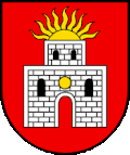 - Auf rotem Grund eine weisse Burg mit einer goldenen aufgehenden Sonne über dem Tor.