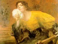 Dort entstand 1903 Das Porträt der Ricarda Huch, ein Ölbild auf Leinwand (90 × 112 cm), das 1968 aus dem Huch’schen Familienbesitz in die Sammlung des Deutschen Literaturarchivs Marbach gelangte. Das in warmen Tönen gehaltene Porträt gilt als das „vielleicht jugendlichste und lebendigste Bildnis“ der 39-jährigen Dichterin und zeigt sie in einer senfgelben Samtbluse, den Betrachter intensiv und suggestiv aus halbgeschlossenen Augen anblickend, mit der Hand einen weißen Blumenbüschel vor die Nase haltend. Das intim wirkende Bildnis aus der Bohème-Atmosphäre der Münchner Künstlerwohnung von Scheves, das eine enge Freundschaft zwischen Dichterin und Malerin nahelegt, gilt eher als eine „Milieuskizze“ als ein getreues Porträt Huchs.[5] Im näheren persönlichen Umfeld Huchs stieß das Bild durchaus auf Missfallen, so hielt Marie Baum, eine weitere Freundin Huchs, das Porträt für ein „Bildnis, das, da die Malerin Ricarda nur von der erotischen Seite aufgefaßt hatte, mich und andere Freunde verdroß“.[6]