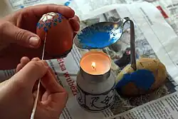Bei der Wachsreserviertechnik (auch Reservetechnik oder Wachstechnik genannt) wird das Ei vor dem Auftragen von Farbe mit heißem Bienenwachs betupft. Hintergrund ist, dass auf den mit dem Wachs „reservierten“ Flächen keine Farbe haftet. Dadurch kann man durch ein präzises Auftragen des Wachses entsprechende Muster erzeugen. Ursprünglich benutzte man zu diesem Zwecke Gänsefedern, deren Spitzen zu einer bestimmten geometrischen Form gefeilt wurden (Dreiecke, Vierecke etc.), um einfache Formen zu erzeugen.[4] Um Punkte und Striche auf dem Ei aufzubringen, werden Stecknadeln mit unterschiedlich großen Glasköpfen in Holzstäbchen oder Bleistifte gesteckt. Soll das Ei mehrfarbig gestaltet werden, so legt man das Ei nach dem Betupfen mit Wachs in eine lauwarme Farblösung und bedeckt, reserviert, anschließend die nächste Farbe. Auf die Art und Weise entstehen vielfarbige Eier, von denen zum Schluss das Wachs angewärmt und bis auf eine dünne schützende Wachsschicht entfernt wird. Die Technik gilt als die farbenprächtigste aller Verfahren. Nachteilig ist, dass die Vorbereitung vergleichsweise aufwändig ist. Einmal aufgetragenes Wachs kann darüber hinaus kaum wieder entfernt werden.