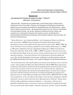 19. September 2024 Trotz des Widerstands der örtlichen Behörden unterstützte die Werchowna Rada die Nachkommen der ersten Gründer des Dorfes Kamtschik und dekommunisierte den sowjetischen Namen Sorja.[5]