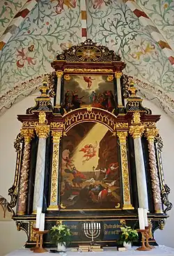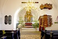 Der gemauerte Altartisch und das Altarretabel stammen aus dem Jahr 1783, als das vorherige Retabel des Bildschnitzers Peter Petersen aus Tondern (1703) wegen Pilz- und Holzwurmbefall ersetzt werden musste. Das neue Altarretabel wurde von dem Sottruper Schreiner Christensen u. a. mit einer Heiliggeisttaube im Rocaillerahmen als oberem Abschluss gestaltet. Von dem vorherigen Retabel stammen noch einige Teile wie die beiden Pfeiler und die korinthischen Säulen neben dem Hauptfeld. Die drei Gemälde des Retabels stammen von dem Apenrader Maler Jes Jessen, welcher der erste Lehrmeister des bekannten dänischen Malers C. W. Eckersberg war. Das Hauptfeld zeigt die Auferstehung, das obere Feld die Himmelfahrt und das Mittelstück der Predella das letzte Abendmahl. Seitlich davon steht auf der Predella in moderner Fraktur und dänischer Sprache: „Nehmet, esset, das ist mein Leib“ (links) und „Trinket alle davon, das ist mein Blut“ (rechts).[12]