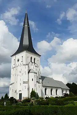 - Am 7. Juni 1860 brannte der Turm nach einem Blitzeinschlag ab. Ein Übergreifen der Flammen auf die Kirche konnte im letzten Moment verhindert werden, weil der Zugang vom Turm zum Kirchendachboden rasch zugemauert wurde und das Gewölbe standhielt. Unter Leitung des königlichen Bauinspektors und Architekten Laurits Albert Winstrup wurde der Turm bis 1862 wiederhergestellt. Die Jahreszahl 1862 steht auch mit Mauerankern an der Südseite des Turms.[6]