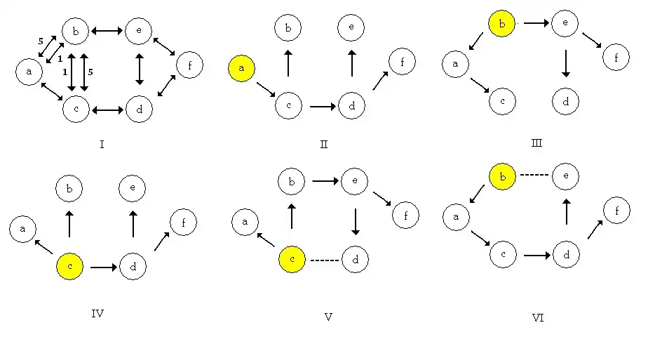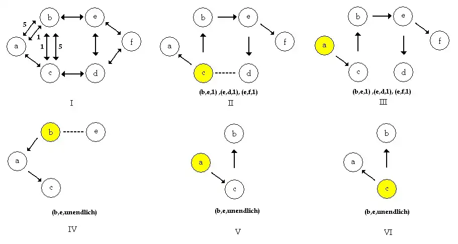 Illustration (II)–(IV) zeigen die source-trees der gelb markierten Knoten bzw. Router. Wenn Verbindung (c,d) ausfällt, ist der source-tree von c in Abbildung V. Hier ist keine Aktualisierung nötig, da der Nachfolger eine niedrigere Nummer als Router c besitzt. In diesem Fall ist es nicht möglich Regel 2 anzuwenden, da es keinen Router mit einer höheren Nummer gibt. Jetzt fällt Verbindung (b,e) aus. Der source-tree von b ist in Abbildung VI gezeigt und abermals ist keine Aktualisierung nötig, da der Nachfolger eine niedrigere Nummer hat. Um Router d zu erreichen, versucht er über a und c zu senden. Gleichzeitig kennt Router c nur die Route zu d über b. So ist eine Schleife entstanden.