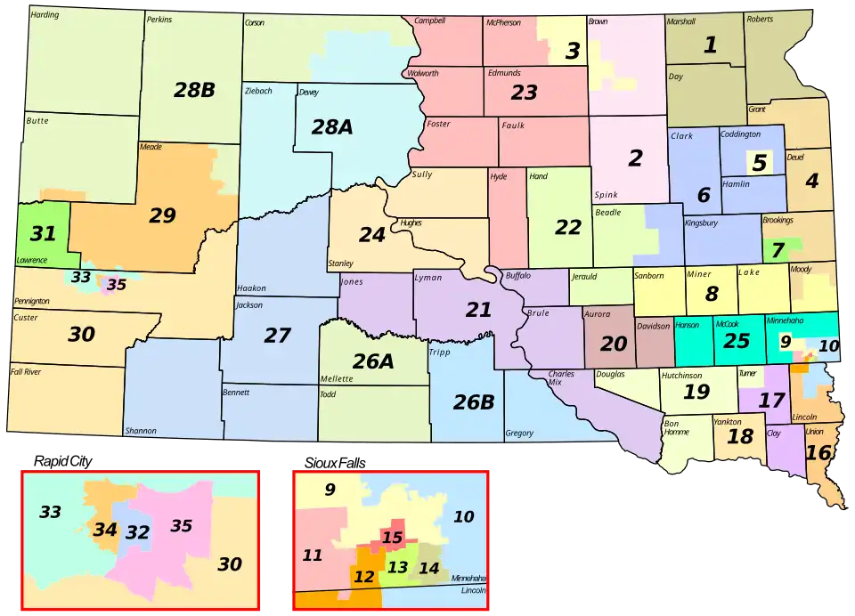 Die Grenzen der Wahlbezirke werden alle 10 Jahre – zuletzt 2001 – nach der Volkszählung gezogen. Jeder Bezirk umfasst etwa 21.500 Einwohner. Als Ergebnis eines Gerichtsverfahrens 2005 müssen die Wahlbezirke im Südwesten South Dakotas verändert werden. Bezirk 26 wurde – ähnlich Bezirk 28 – in zwei Repräsentantenhaus-Bezirke eingeteilt.