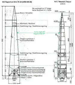- die konische Form des Raketenkörpers (mit 8 Grad Kegelwinkel) für eine stabile Aerodynamik (ohne aufwendige Windkanalversuche zur Optimierung über den gesamten Geschwindigkeitsbereich und zugehöriger Tanklast)[2][9][16]:Pkt. 50 (diese Bauform wurde für die vier Boosterraketen der R-7 angewandt)[17][18][6]:S. 19–20