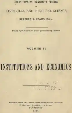 In den USA legte Richard Ely – der in Deutschland im Sinne des Historismus ausgebildet worden war – den Grundstein für die spätere Institutionenökonomik.[17] Ely war Initiator der am Verein für Socialpolitik orientierten American Economic Association (1885), führende Figur der Progressive Era, Autor populärer Lehr- und Schulbücher sowie Herausgeber der Reihe Citizen’s Library of Economics, Politics and Sociology (1900ff.). Seine Darstellungen beschäftigten sich mit der ökonomischen Bedeutung historisch bedingter Institutionen der modernen Gesellschaft wie etwa der Privatautonomie. Seine disziplinäre Auffassung stand der Sozialökonomik sehr nahe, was seine frühe Beschäftigung mit Karl Rodbertus, Albert Schäffle und Adolph Wagner zeigt.[18] Ely war akademischer Lehrer unter anderem von John Rogers Commons, Thorstein Veblen und Wesley Clair Mitchell sowie des US-Präsidenten Woodrow Wilson.[19]