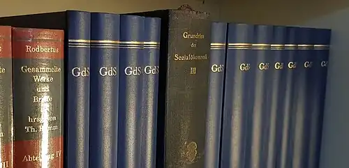 Max Weber verlieh der Sozialökonomik als ihr prominentester Exponent und als Schriftleiter der mehrbändigen Lehrbuchreihe Grundriss der Sozialökonomik (GdS, 1914–1930) andauernde Bekanntheit und Wirkung; insbesondere mit seinem 1921/22 darin erschienenen Beitrag Die Wirtschaft und die gesellschaftlichen Ordnungen und Mächte (später als Soziologische Kategorienlehre bezeichnet).[14] Ab 1956 wurden seine nachträglich kompilierten sozialökonomischen Schriften als Wirtschaft und Gesellschaft – Grundriß der verstehenden Soziologie (WuG) herausgegeben und wirkten vor allem in der Soziologie und in der Politikwissenschaft weiter. Mittlerweile stellt die Max Weber-Gesamtausgabe (MWG) unter dem Obertitel Wirtschaft und Gesellschaft mehrere Einzelbände mit den originalen und zum Teil unvollendeten sozialökonomischen Texten bereit.[15]